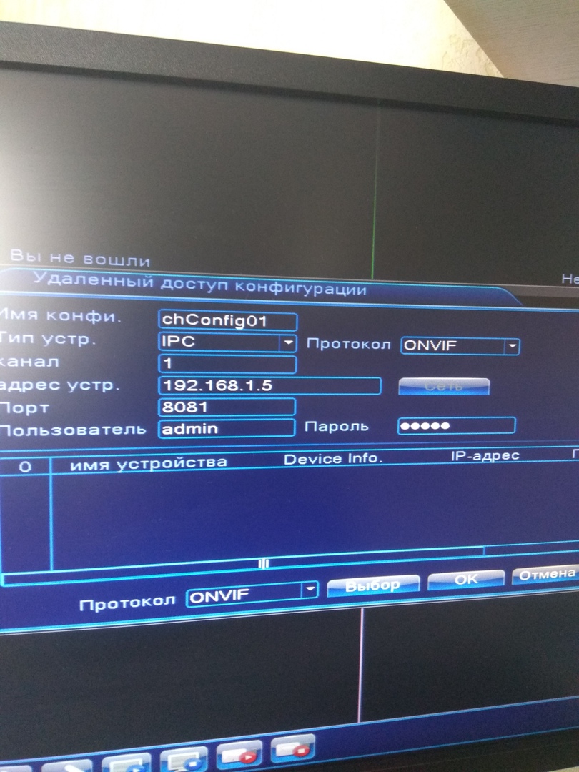 Потом добавляем камеру в ручную, возможно в регистраторе уже готовые профили настроек по моделям камер, я добавлял RVI , там ее не было. Потому поставил ONVIF. Предварительно зашел на камеру с браузера, при первом включении требует замены пароля. Далее в настройках логин admin пароль который назначили. Камера нашлась сразу. Удачи Вам в настройках.