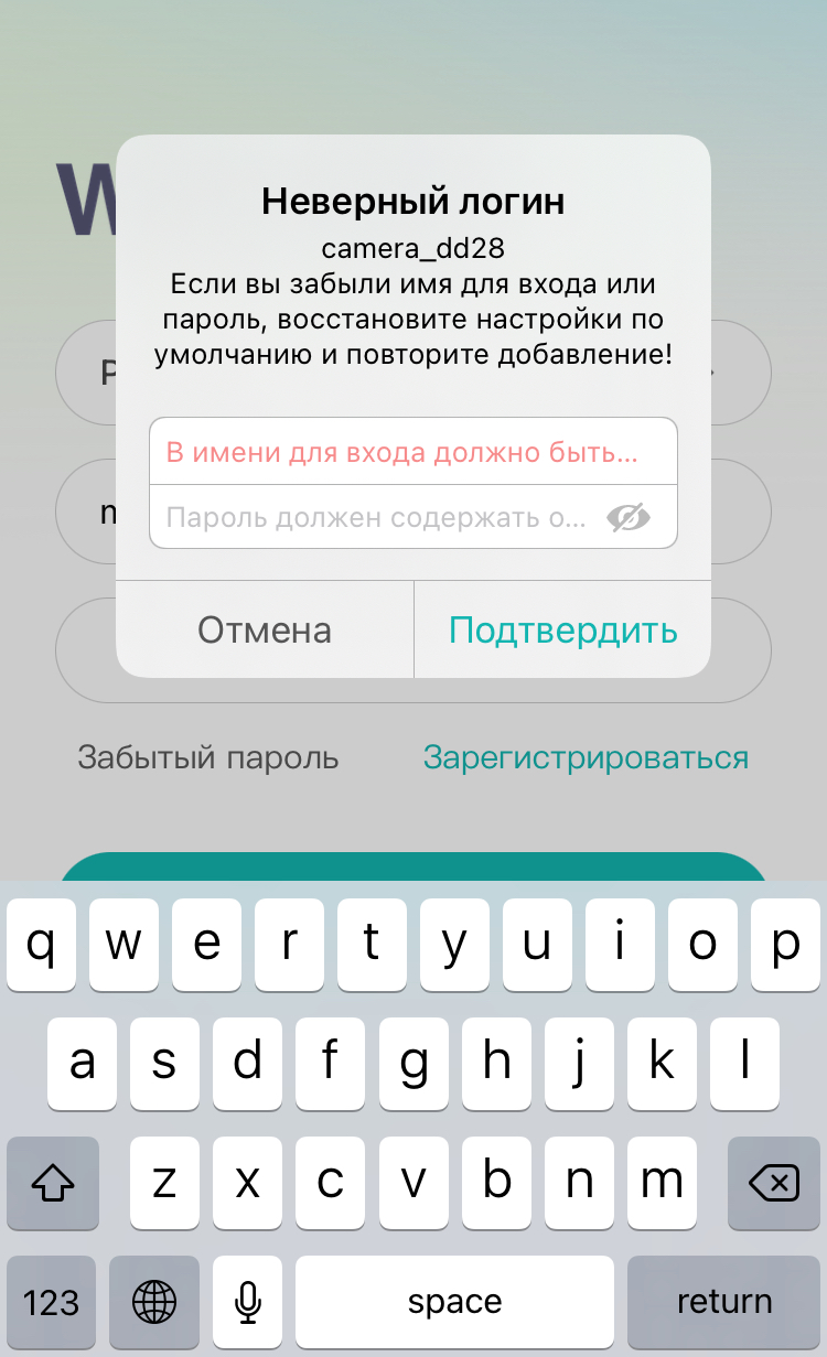 В самом приложении имя и пароль сохранены, те данные что в инструкции (при создании сети от камеры к телефону, типа пароль 1234567890) не подходят.