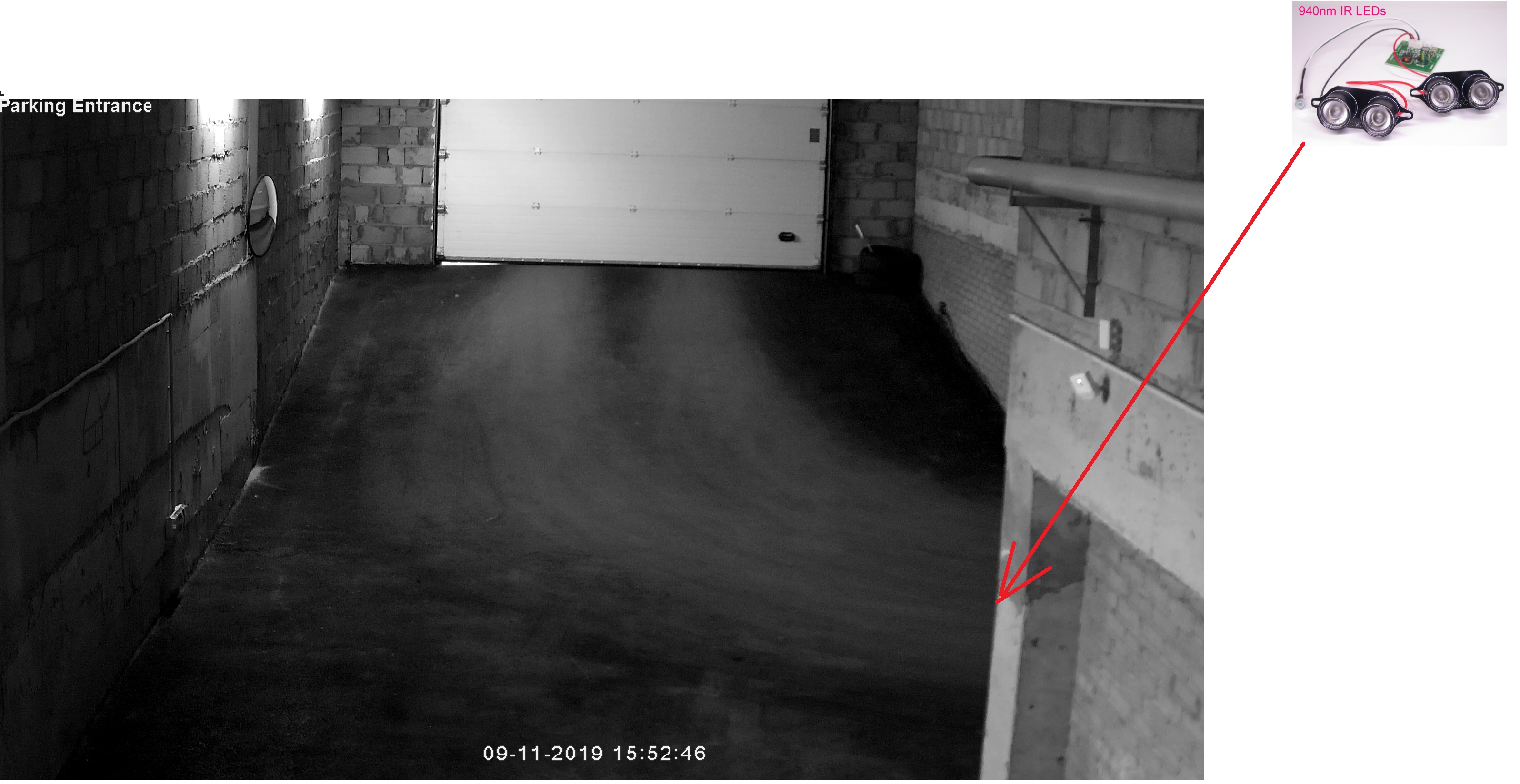 Планирую приобрести у хлонга модуль с четырьмя ИК-светодиодами и разместить его на стене (показал стрелкой) и направить на въезжающие автомобили. Как думаете - поможет?