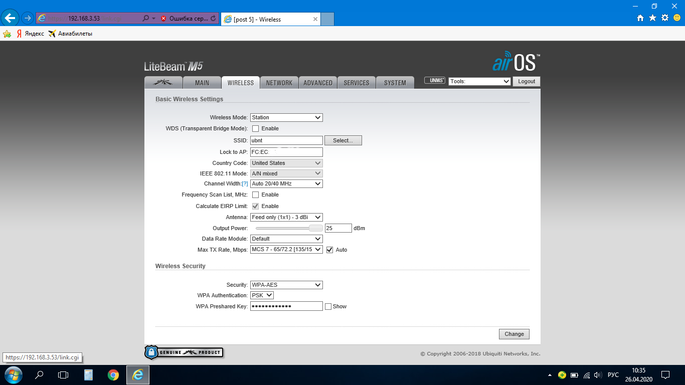 Выберите в этом пункте максимальное значение dBi. Это касается и остальных антенн beem (подозреваю что там так же) и все наладится.