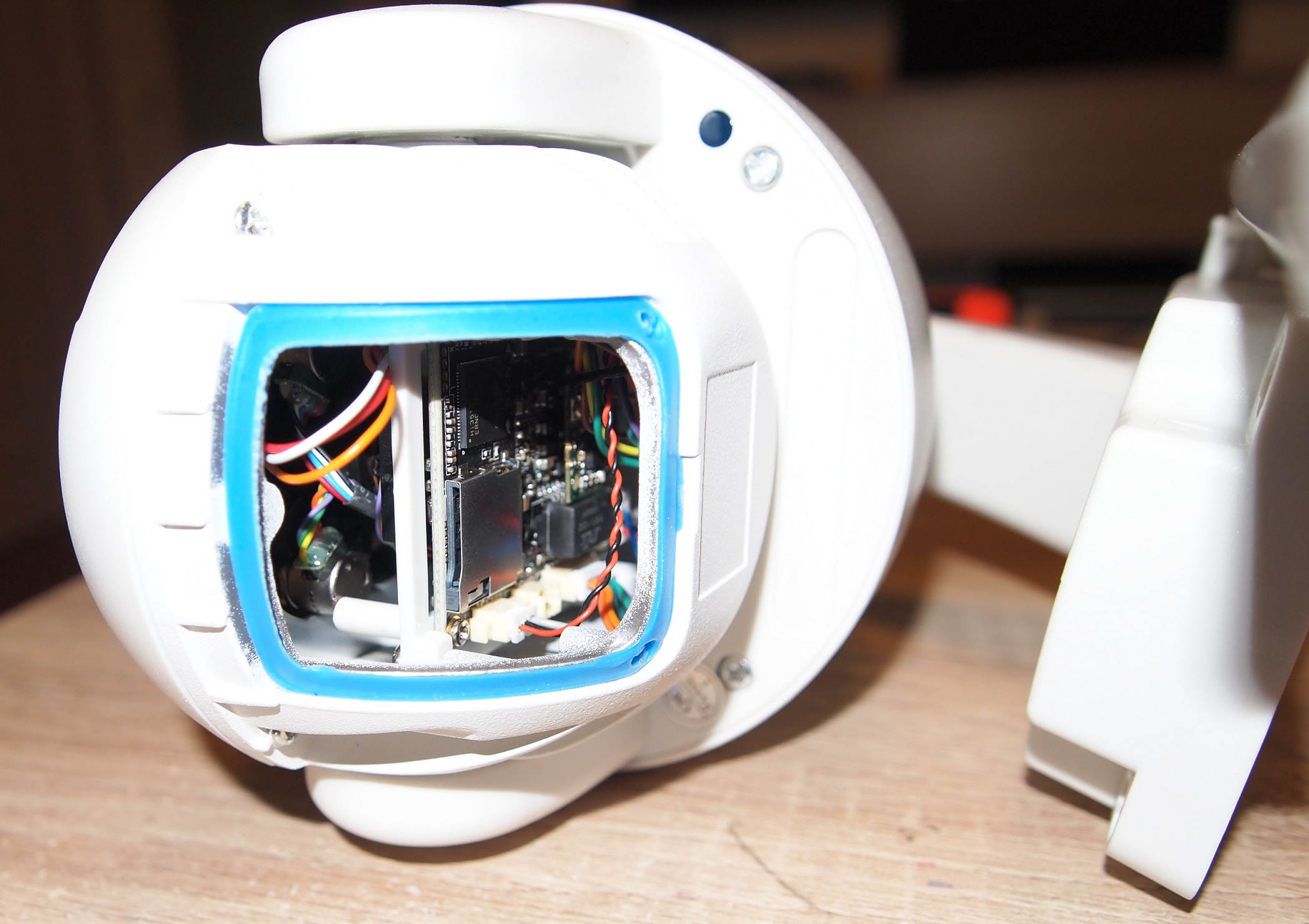 Внутри LAN-кабель приходит в плату, на которой расположен драйвер для управления PTZ, к которому подключены электромоторы. (на фото слева)