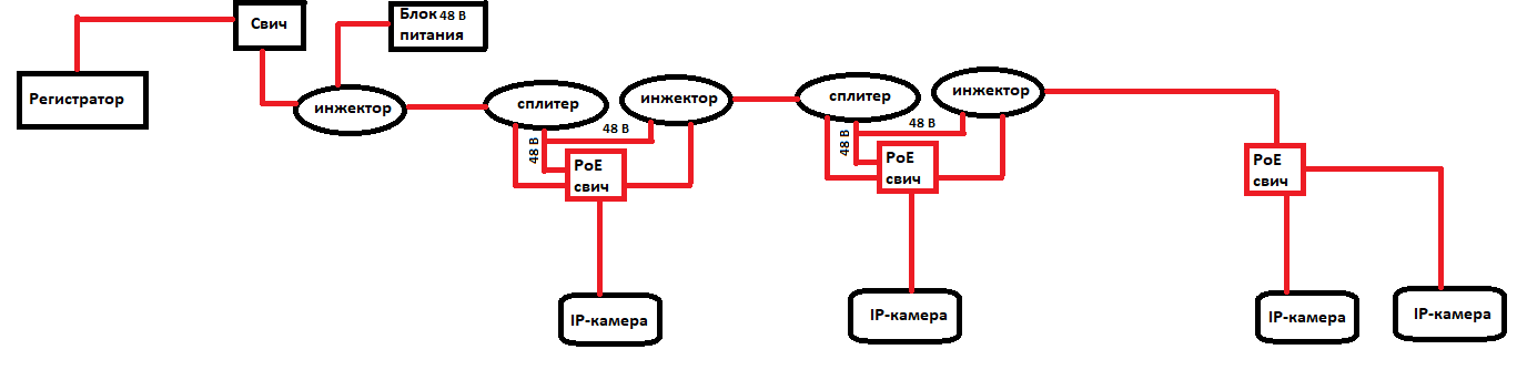 который уже питает первую камеру и далее на второй PoE-свитч и вторую и третью камеры.
