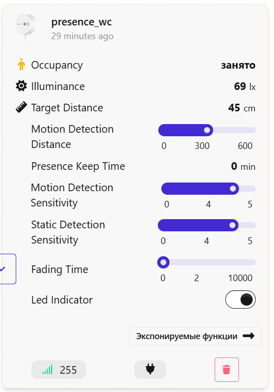 Подцепил его к Zigbee2MQTT В целом в результате эксплуатации выяснил, что датчик движение и присутствие определяет корректно, и мне не удалось его обмануть, замерев на белом камне. Однако в процессе эксплуатации выяснилась одна неприятная особенность... Он ОЧЕНЬ долго теряет присутствие.