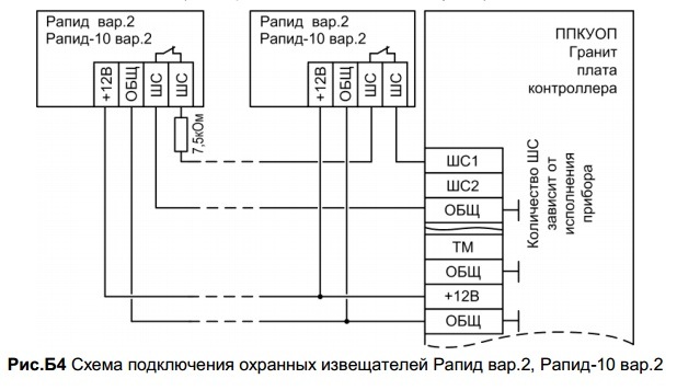 Можно нарисовать наглядную схему подключения: гранит3а - 2 извещателя магнитоконтактных(ИО 102-2) - 2 извещателя охранных(рапид в.2) - 2 извещателя пожарных (ИП 212-141) - 1 оповещатель (гром 12К) - 1считывательТМ.