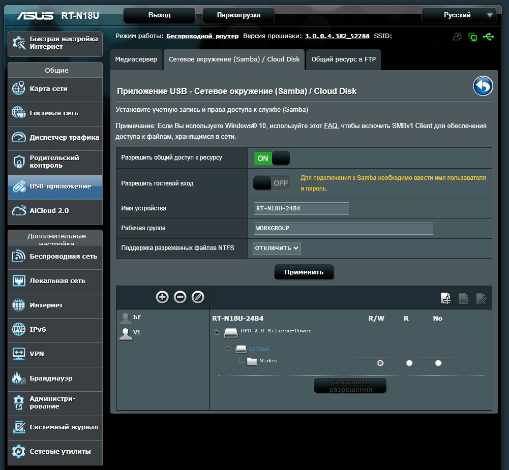 2. В роутере какую учетку нужно выбрать: hf или Vi? (у обоих право включено R/W, на фото)
