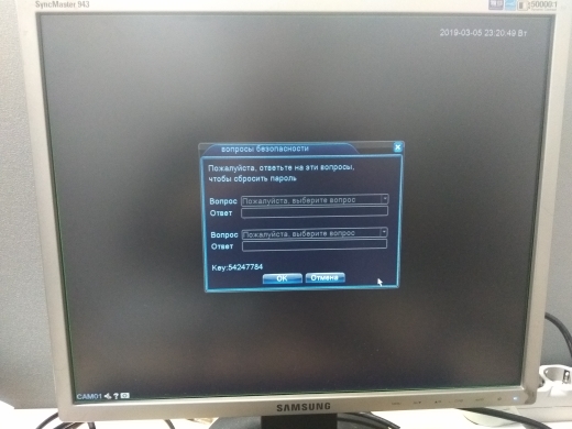 Батарейку вынимал, сбрасывал статическое напряжение, в общем бестолку. Дата и время не сбрасываются (пользовался софтами генерации паролей с привязкой к дате регистратора, не помогло, думаю для начала надо сбросить на заводские настройки, что не получится, видимо память настроек не энергозависимая ) В меню авторизации под кнопкой вопроса есть пустые поля с вопросами и Ключ (54247784). Заранее спасибо!