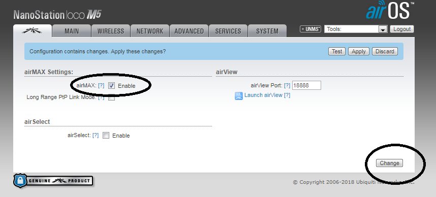 Переходим на вкладку airMax и ставим галку (тем самым включая режим airMax) и сохраняем Change ни в коем случае не нажимаем apply Переходим на вкладку wireless и работаем там
