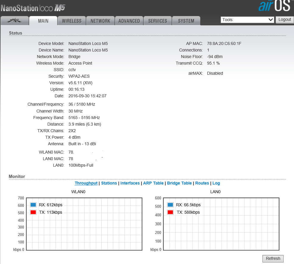 Случилось страшное. Повесил я тут 3 камеры на wi-fi nanostation loco M5. Все вроде ни чего, видимость прямая, расстояние около 200 метров, но нет нет, да потухнут камеры. Канал при этом не падает, просто не пролазит трафик с камер. Ниже скрины с Loco, кто более опытный в этих мостах, может что подскажите что подкрутить? Желательно так что-бы канал не уронить, иначе ехать далеко.