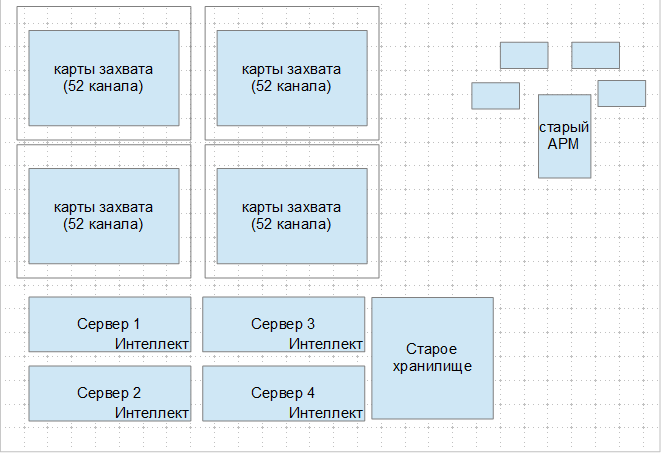 Реги 16-канальные, но с учетом того, что в каждом ящике нынче 13 карт захвата по 4 канала, получается 52 камеры, и чтобы это равномерно раскидать на 4 рега и был запас, я решил к каждому регу подключать по 13 камер.
