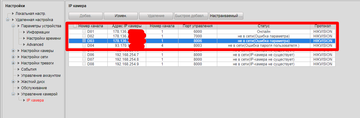 По какой то причине мой регистратор HikVision DS-7108NI-SN , ни никак не хочет принимать удаленные IP-камеры HikVision в друзья, чтобы записывать с них видео.