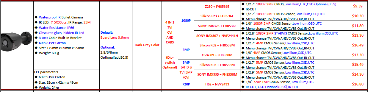 Спасибо всем за ответ. Ссылки нет, вложил кусок прайса целиком. Задача просто выбрать оборудование с хорошим изображением день/ночь. Просто с таким объективом ночью изображение плохое будет мне кажется, не говоря уже о цвете.karadjia писал(а):Ребята, знатоки подскажите пожалуйста, китайцы предлагают камеры 5мп Silicon K03 + FH8538M и объектив светосилой F2.6