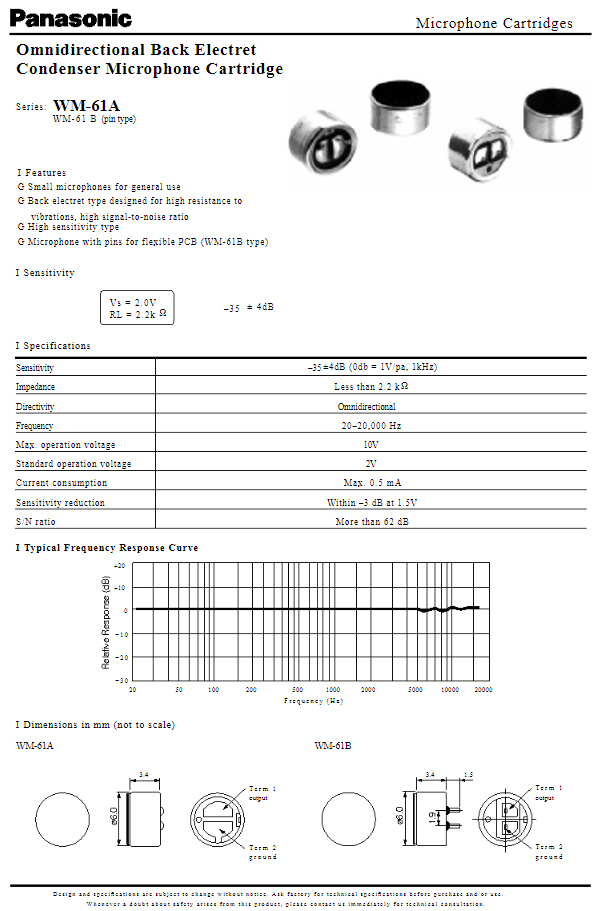 Микрофон американской компании PUI Audio , производство США . Альтернативная замена для штатных микрофонов , альтернатива Panasonic wm-61a (по чувствительности и чистоте записи POM-3535P-2-R лучше чем Panasonic ).