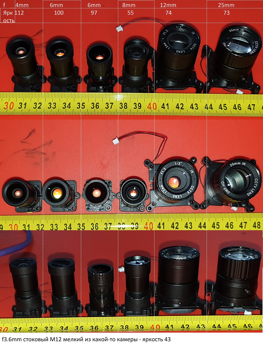6 мм тоже разные светосильные объективы существуют, вот два из разных поставок от одного поставщика, тот который пониже и пошире имеет меньше диаметр внешней линзы. В тесте , как я понимаю, использовался который справа.