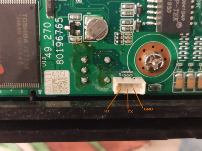 Поделюсь наблюдениями и неудачами, вдруг кому-то пригодится. Мультиметром обнаружил GND-пин на разъёме. Далее поочерёдно подключал каждый пин по отдельности к контакту RX преобразователя, и подавал питание на панель, таким образом в терминале появилась такая картина