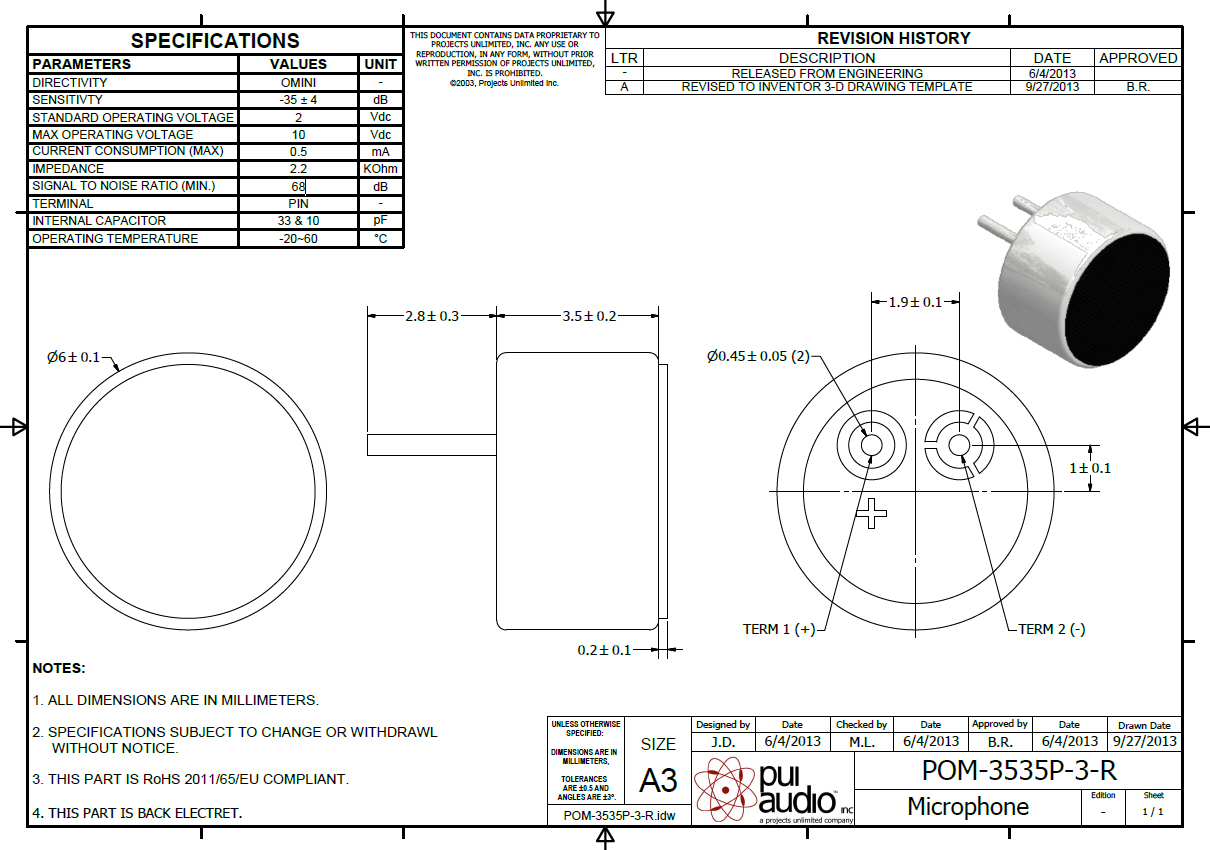 Микрофон американской компании PUI Audio , производство США . Альтернативная замена для штатных микрофонов , альтернатива Panasonic wm-61a (по чувствительности , шумам и чистоте записи POM-3535P-2-R лучше чем Panasonic WM-61A ).