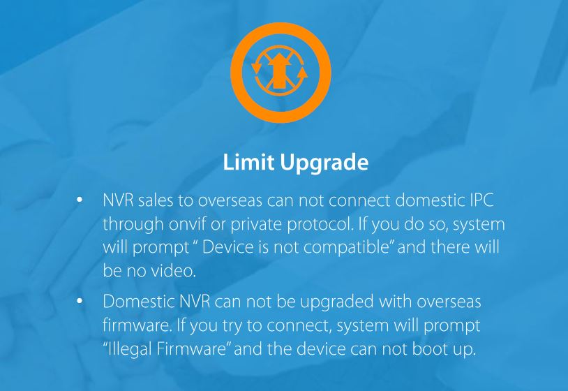 0. NVR sales to overseas can not connect domestic IPC through onvif or private protocol.
