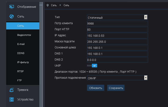 192.168.0.53 порт 83 порт RTSP 556 порт клиента (не знаю что это такое) 9988
