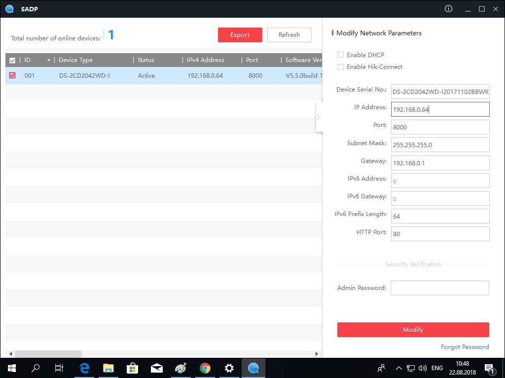 Адрес камеры изменен с "родного" 192.168.1.64 на 192.168.0.64 с помощью программы sadp.