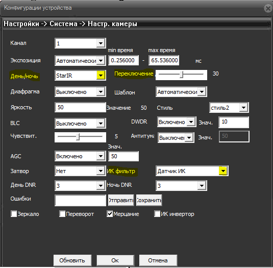 Добрый день, помогите подобрать настройки, для перехода с цветного на Ч.Б режим. Камера на IMX 307, хорошо работает в сумерках, но она переходит в режим ЧБ буквально сразу как начинает темнеть. Скажите, какие настройки отвечают за этот переход, хочется сделать, чтобы с цвета на чб переходило значительно позже. Спасибо!