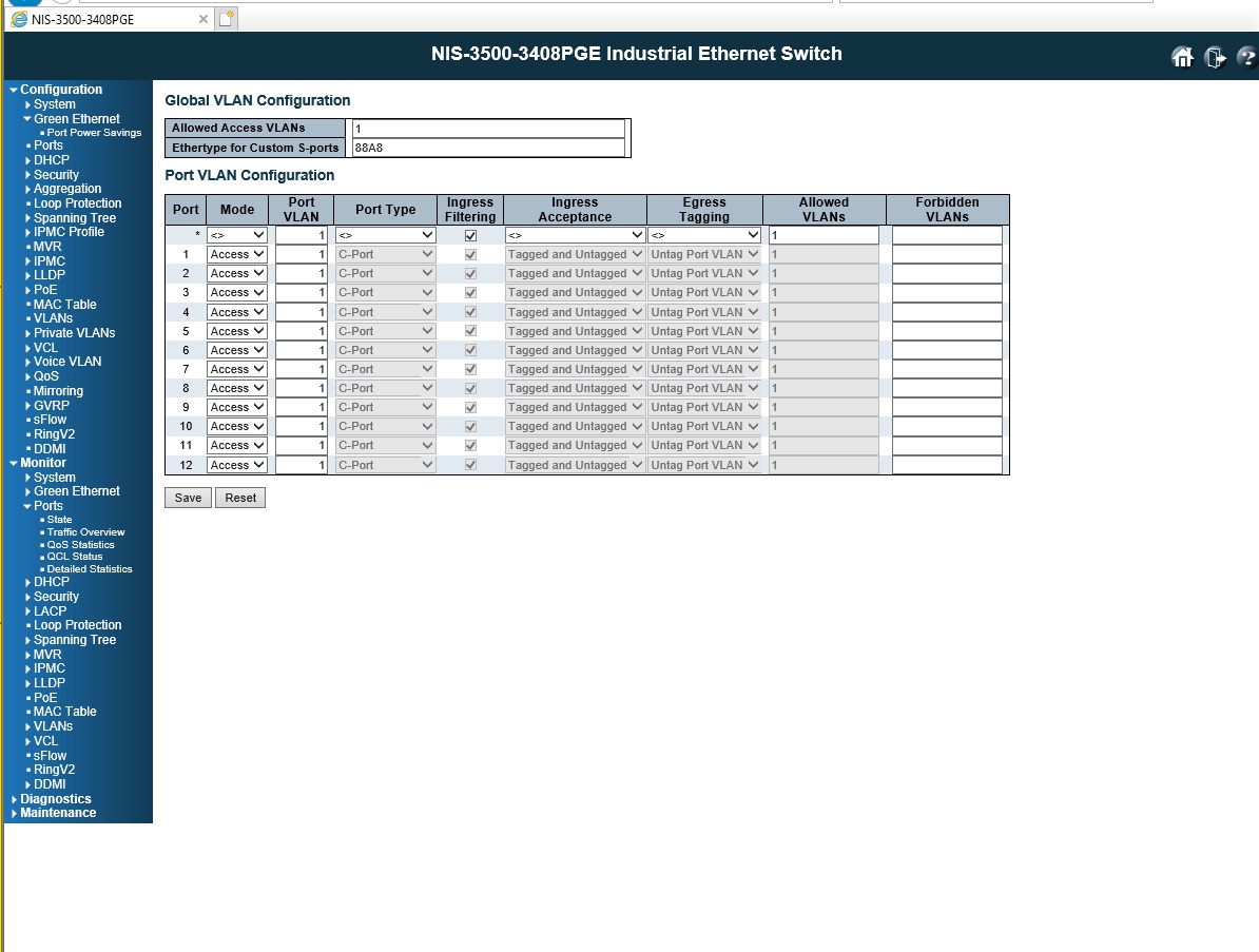 Камеру проверял в таком же коммутаторе, в рабочие порты вставлял, до заводских настроек сбрасывал. Прикрепил настройки Port, Green Ethernet, VLAN.