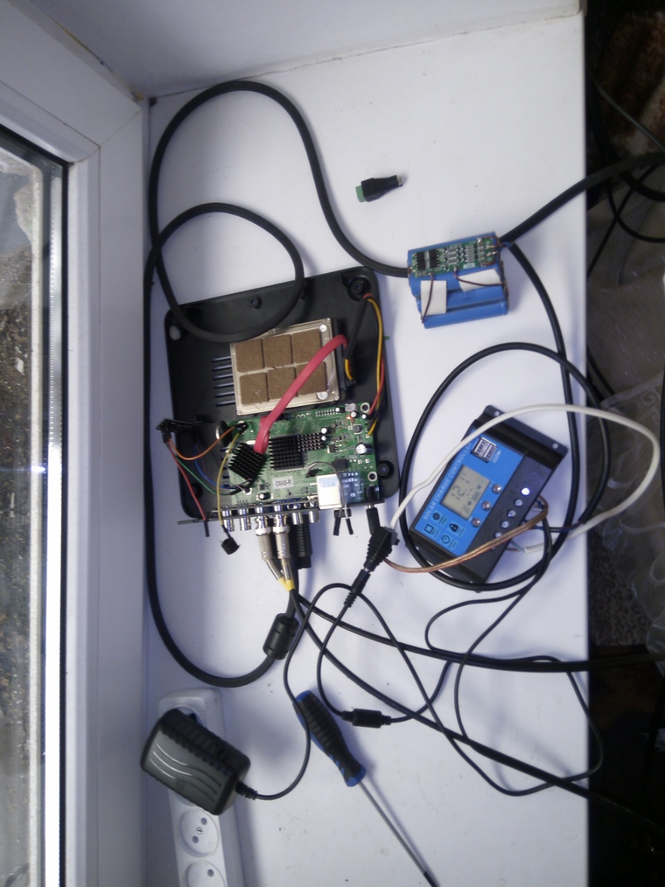 Сегодня ночью рубанули свет на районе, пять раз его пытались включить. То на три минуты, то на минуту, что-то у них там выбивало. А, так как в соседнем районе машинам резали колеса несколько дней подряд и уже добрались до нашего то простой регистратора сравни вообще отсутсвию какого либо видеонаблюдения т.е польза равнялась нулю. На скорую руку за 15 мин был собран симбиоз из ШИМ контроллера солнечной панели, сборки из 6 литиевых аккумуляторов добытых из не рабочей батареи ноута (собирал недавно для шуруповерта со своим отдельным контроллером заряда) емкостью 4800 ма. Весь этот огород проработал 4 часа непрерывной записи: регистратор+ 2 камеры AHD с включенной подсветкой Ik. И самое полезное из такого симбиоза вход контроллера солнечной батареи расчитан на питание до 50 вольт ток заряда 20 ампер, выход на 14,7 в. :pardon: