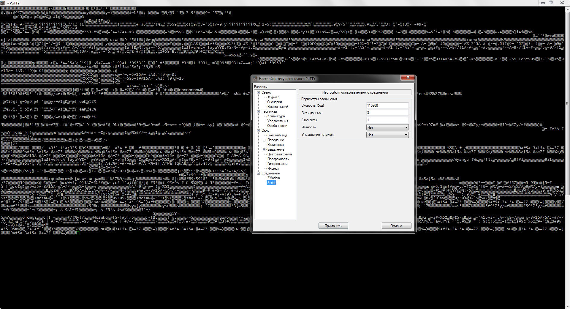 подпаялся к UART (?). кабель короткий, медный, экранированный. Putty выдаёт билеберду. выделенный на скриншоте квадрат билеберды, одинаков на всех компах и конвертерах.