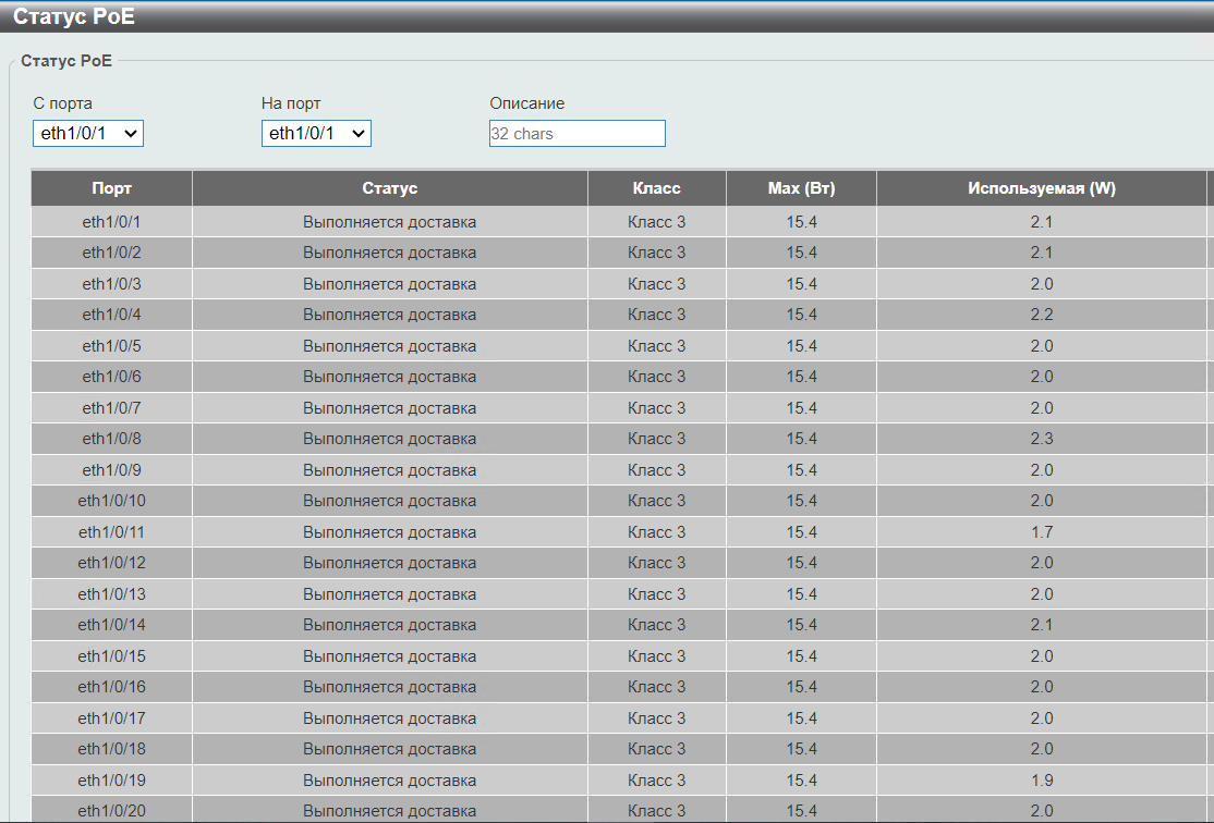Вот скрины с объекта. 48 портовый коммутатор, 32 камеры, 6 точек доступа.