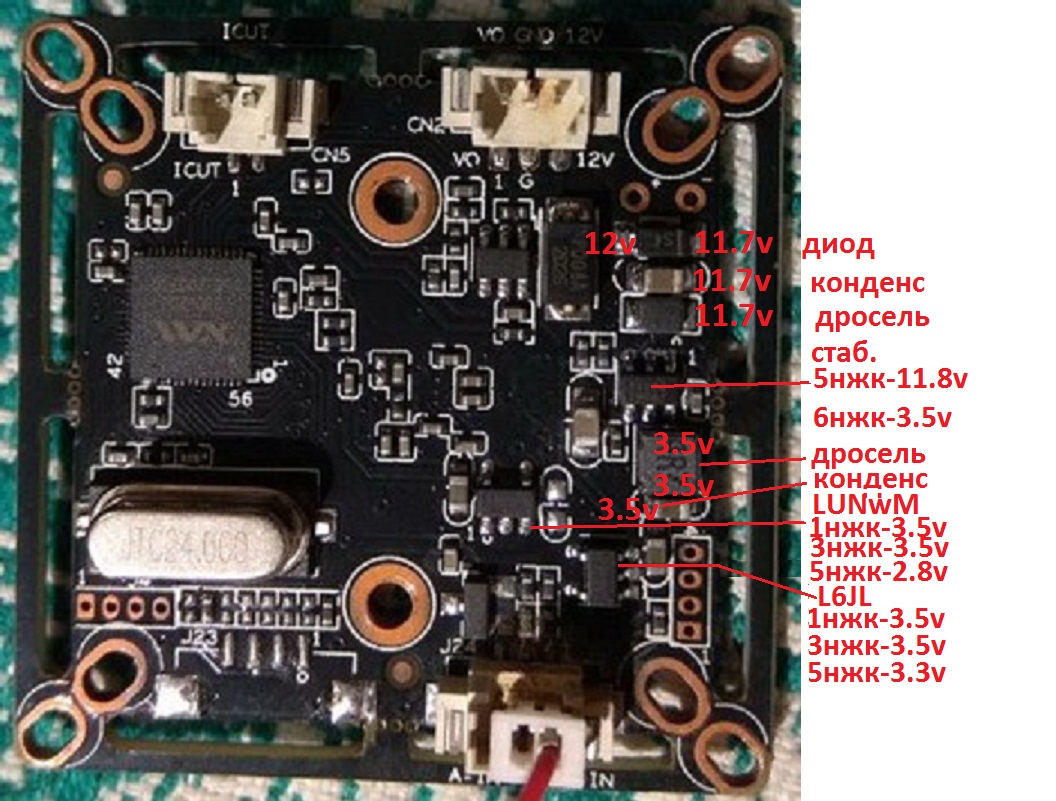 Промерил напряжения на плате, сделал скрин. Никогда ранее модули камер не ковырял, может кто подскажет где какая должна быть напруга. Буду благодарен за любую помощь!